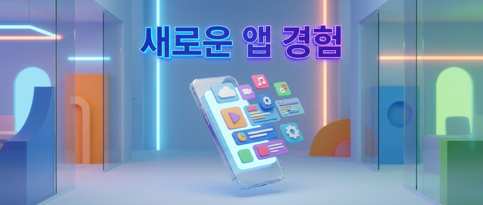 Modern 3D app promotion banner, smartphone with 3D UI elements popping out of screen, colorful floating 3D icons, Korean text '새로운 앱 경험', tech startup aesthetic 3D render, 21:9 ultrawide aspect ratio