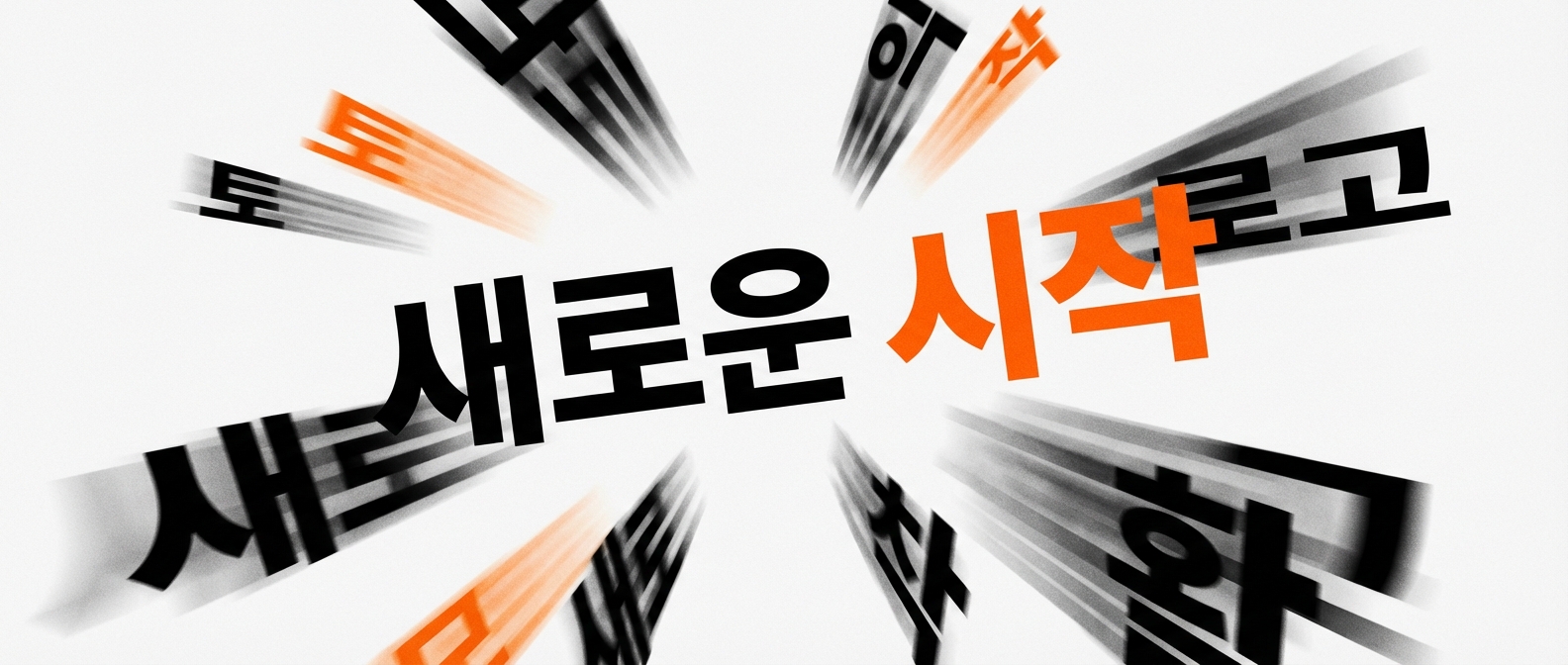 Kinetic typography banner, Korean text '새로운 시작' in dynamic motion with blur trails, letters scattered in perspective, bold black on white with single orange accent, modern editorial design, 21:9 ultrawide aspect ratio