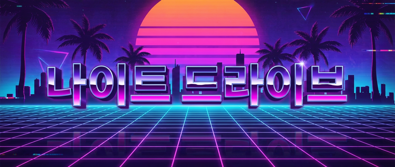 Synthwave retro banner, chrome Korean text '나이트 드라이브' over neon grid horizon with sunset, palm tree silhouettes, electric purple and hot pink gradients, 80s retro futurism aesthetic, 21:9 ultrawide aspect ratio