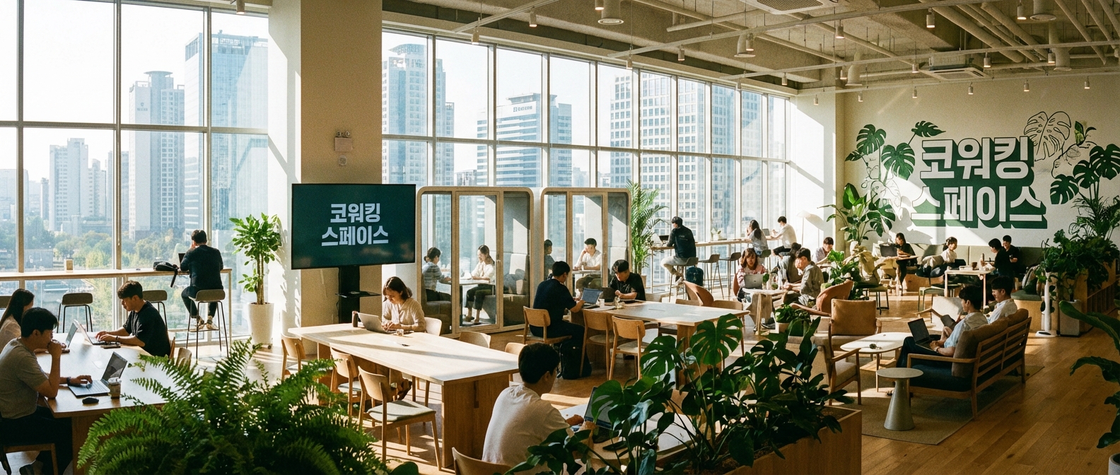 Modern co-working space banner, bright open office with diverse workstations, large windows with city view, plants and natural light, Korean text '코워킹 스페이스', startup culture aesthetic, 21:9 ultrawide aspect ratio