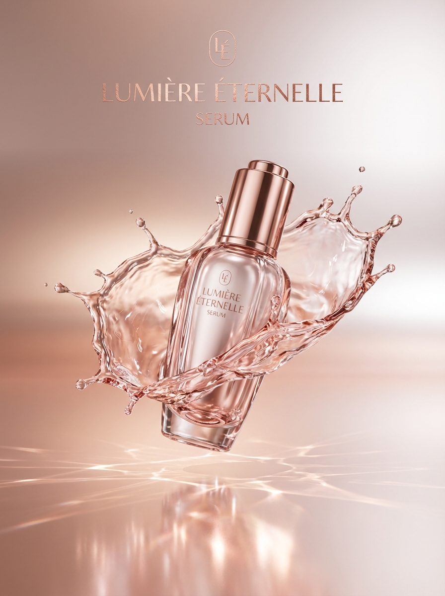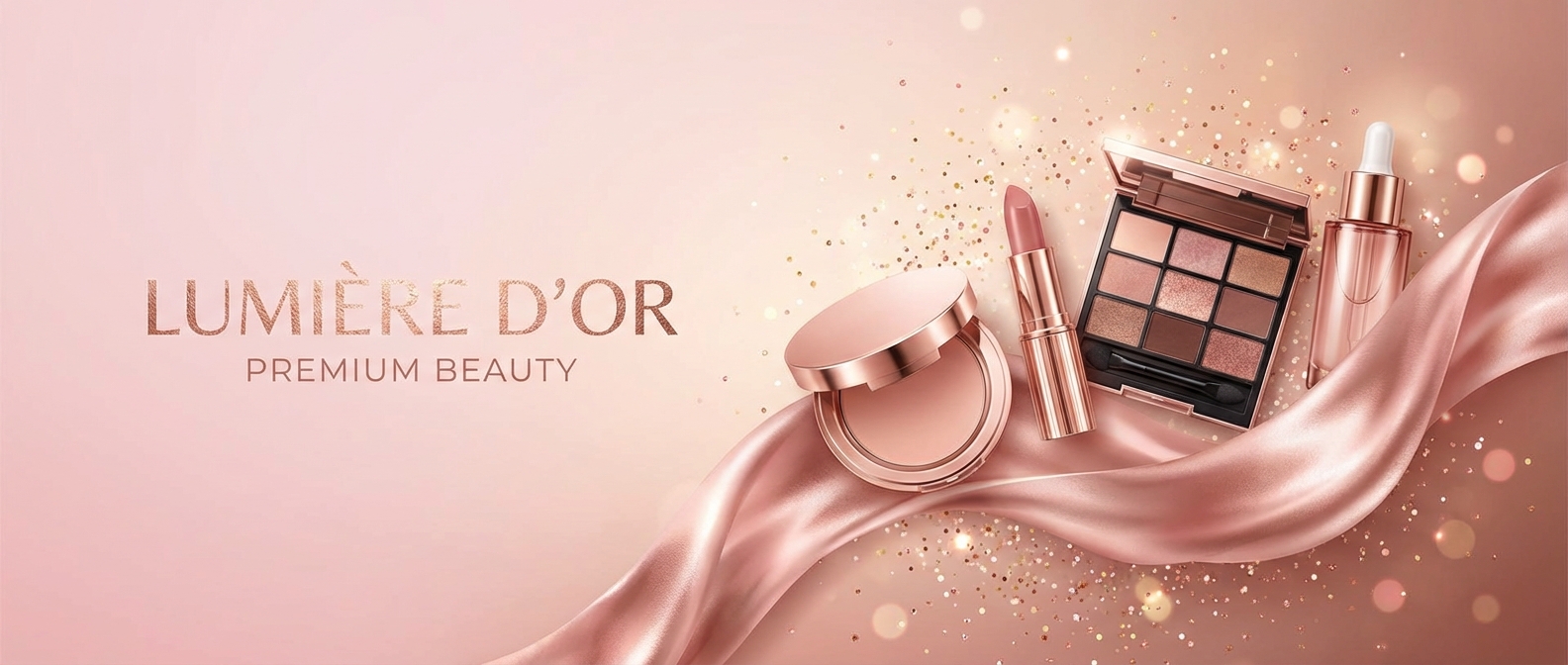 'silk ribbon flowing'이 고급 뷰티 브랜드의 우아함을 전달합니다. 'pink to rose gold'는 뷰티 업계의 클래식 색 조합입니다. 'sparkle particles'로 화려한 글래머 느낌을 더하세요.