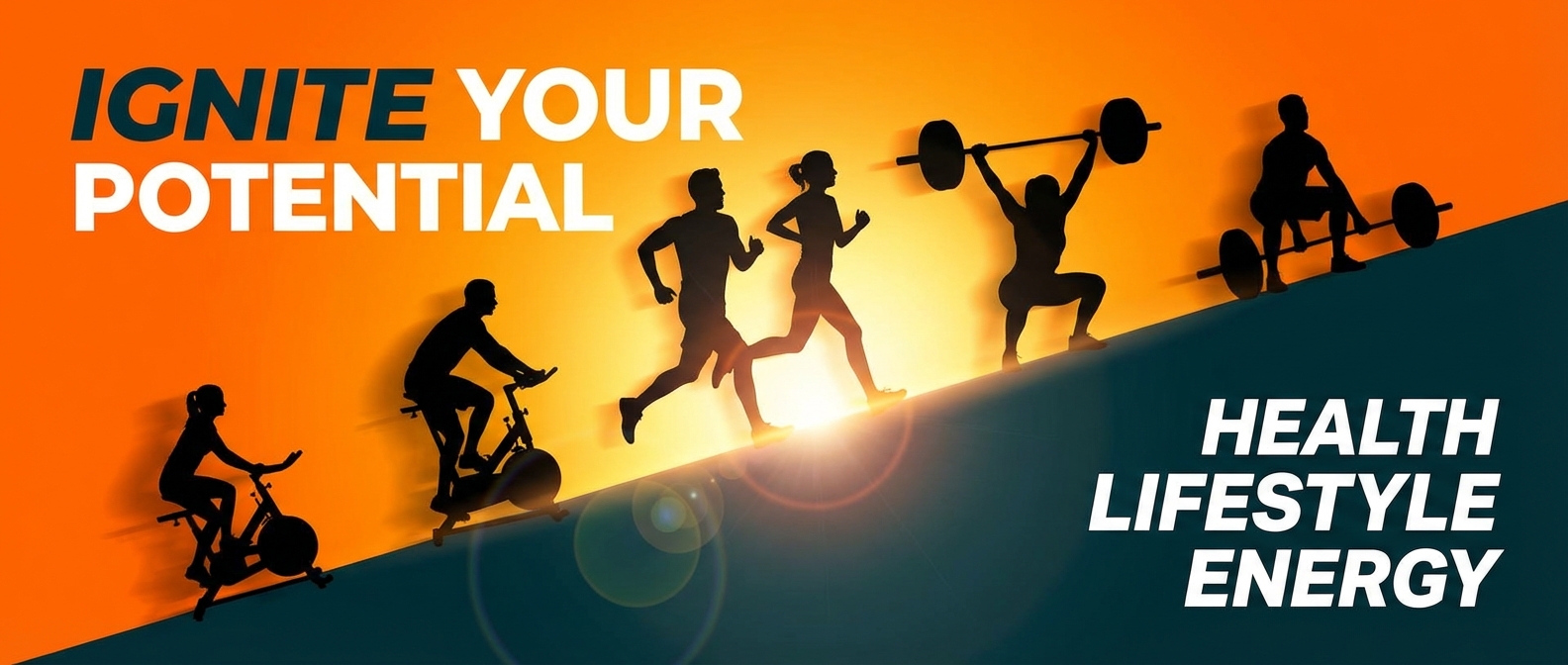 Energetic fitness center banner, dynamic gym equipment silhouettes against sunrise gradient, orange and dark teal split composition, motivational energy, Korean text '오늘도 운동', health lifestyle, 21:9 ultrawide aspect ratio