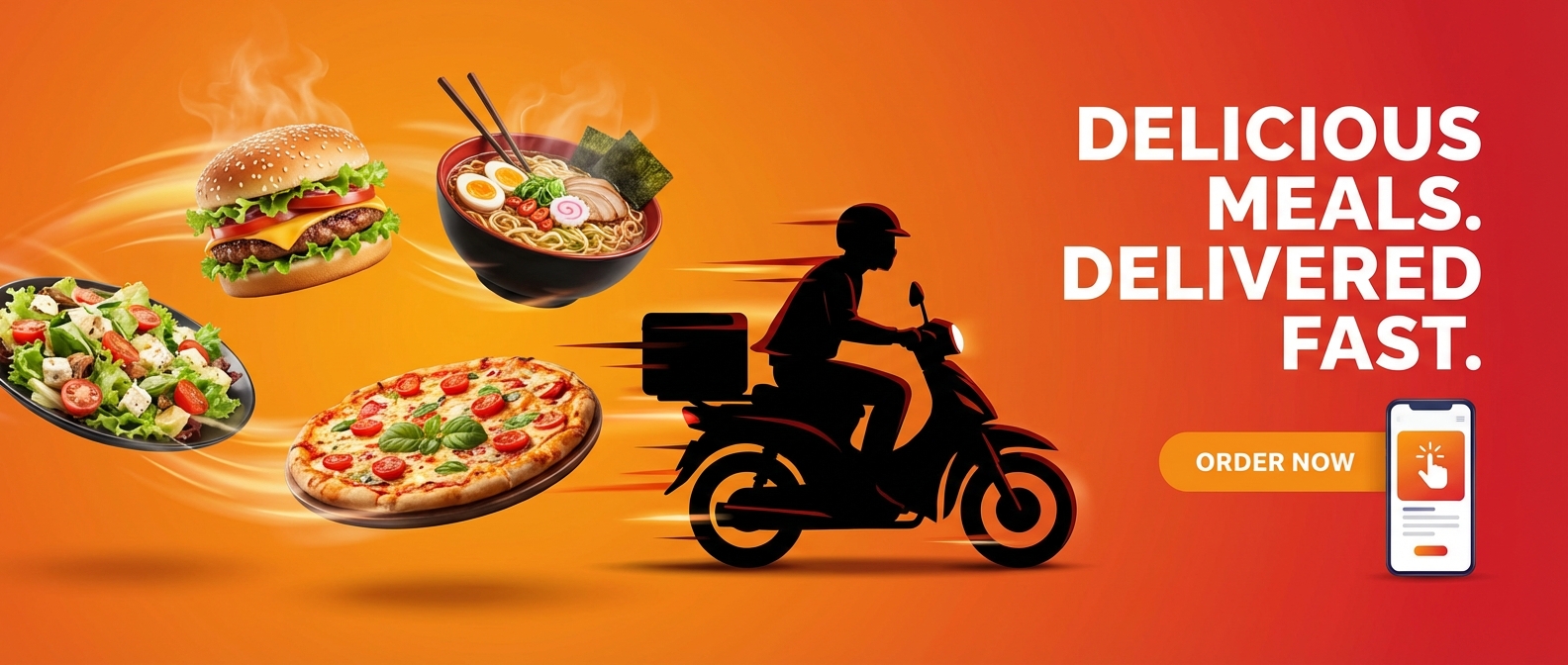'orange to red'가 식욕과 긴급함을 동시에 자극합니다. 'floating meals'로 다양한 메뉴를 한 화면에 보여주세요. 'delivery bike silhouette'로 빠른 배달을 시각적으로 전달합니다.