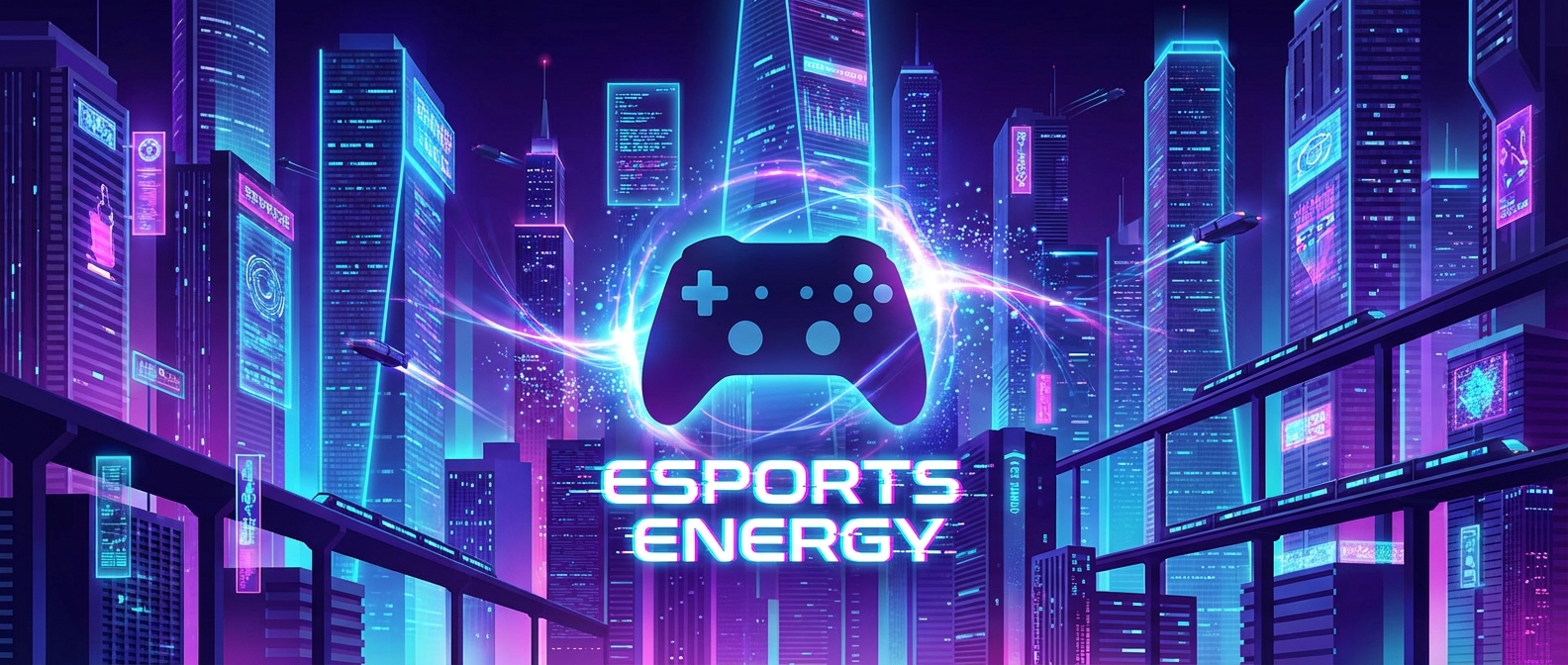 Epic gaming scene with explosive neon effects, futuristic HUD elements glowing in cyan and magenta, dark atmospheric background with particle effects, dynamic action composition, competitive esports energy, 16:9 aspect ratio