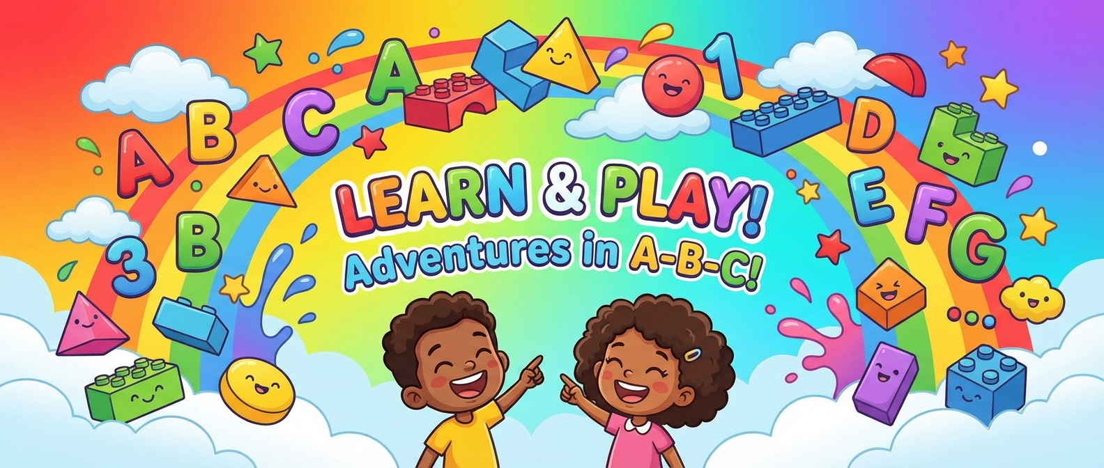 'rainbow gradient'와 'building blocks'가 아이들의 호기심을 자극합니다. 'alphabet letters'를 교육 주제에 맞는 요소(숫자, 악기 등)로 변경하세요. 밝고 친근한 톤을 유지하세요.