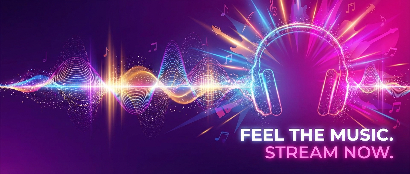 'sound equalizer waves'가 음악의 역동성을 시각적으로 표현합니다. 'deep purple to electric pink'는 음악 플랫폼의 트렌디한 색 조합입니다. 'headphones silhouette'를 악기나 스피커로 변경하면 다른 음악 서비스에도 활용 가능합니다.