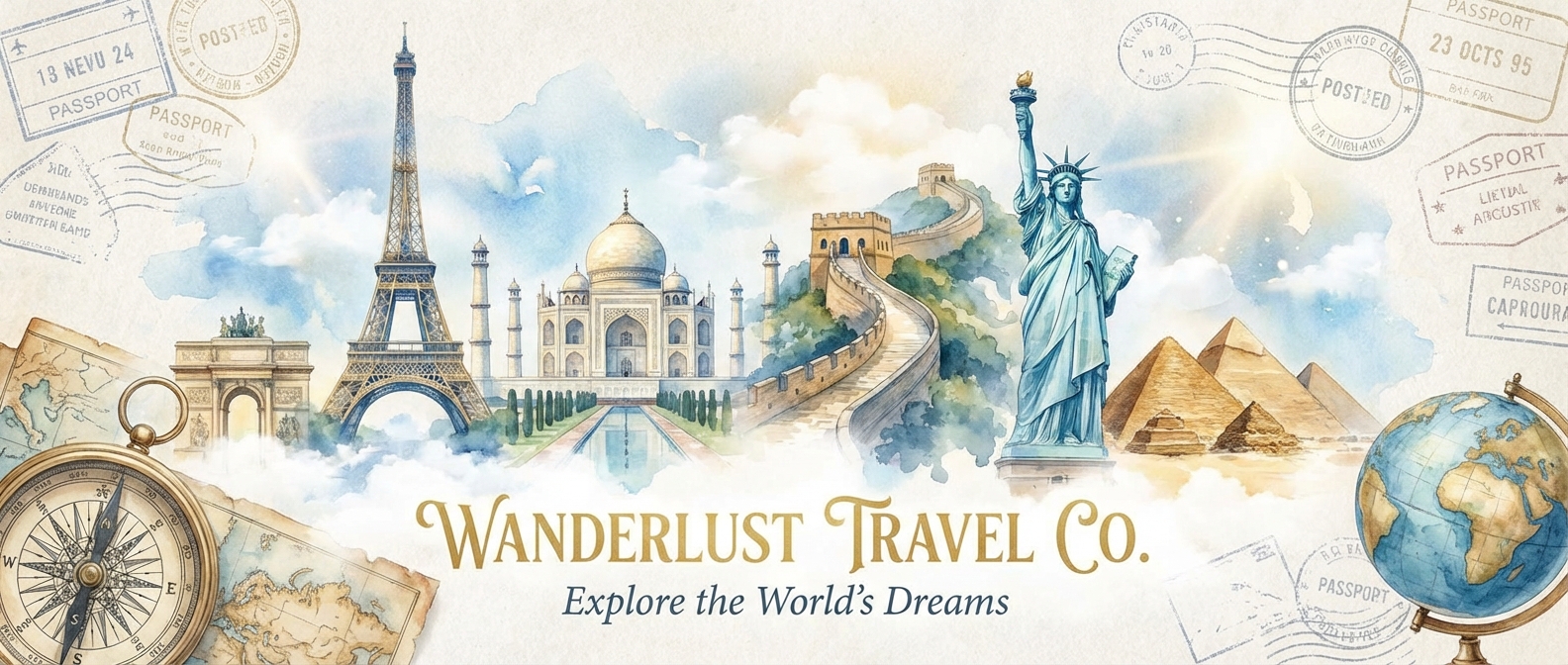 'watercolor style landmarks'가 여행의 로맨틱한 감성을 전달합니다. 'passport stamp textures'로 세계 여행의 경험을 표현하세요. 'blue and gold'가 프리미엄 여행 서비스의 신뢰감을 만듭니다.