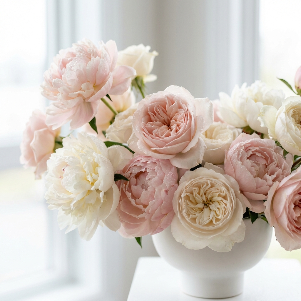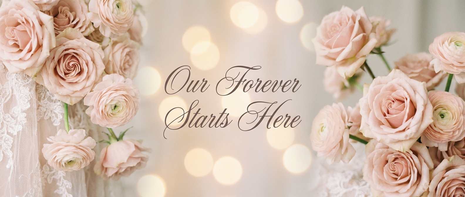 'blush pink flowers'와 'lace texture'가 로맨틱한 웨딩 분위기의 정석입니다. 'gentle bokeh lights'로 동화 같은 분위기를 연출하세요. 시즌별로 꽃 종류를 변경하면 더 트렌디합니다.
