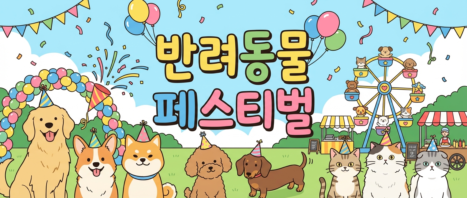 Playful pet event banner, cute cartoon dogs and cats celebrating with party hats and confetti, bright festive colors, Korean text '반려동물 페스티벌', balloon decorations, cheerful party illustration, 21:9 ultrawide aspect ratio