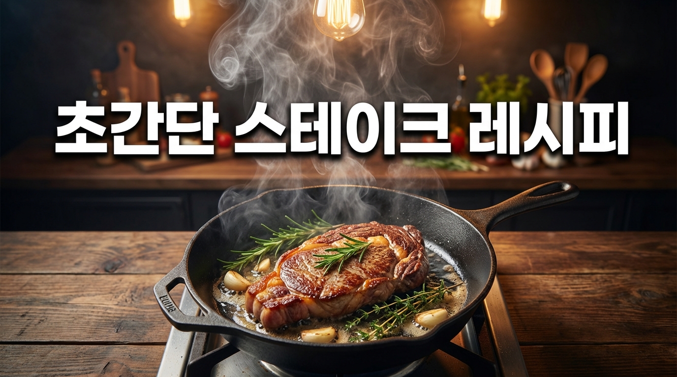 Appetizing cooking scene from above, sizzling pan with golden steak and herbs, steam rising dramatically, kitchen ingredients scattered artfully, warm tungsten lighting, food video thumbnail style, mouth-watering composition, 16:9