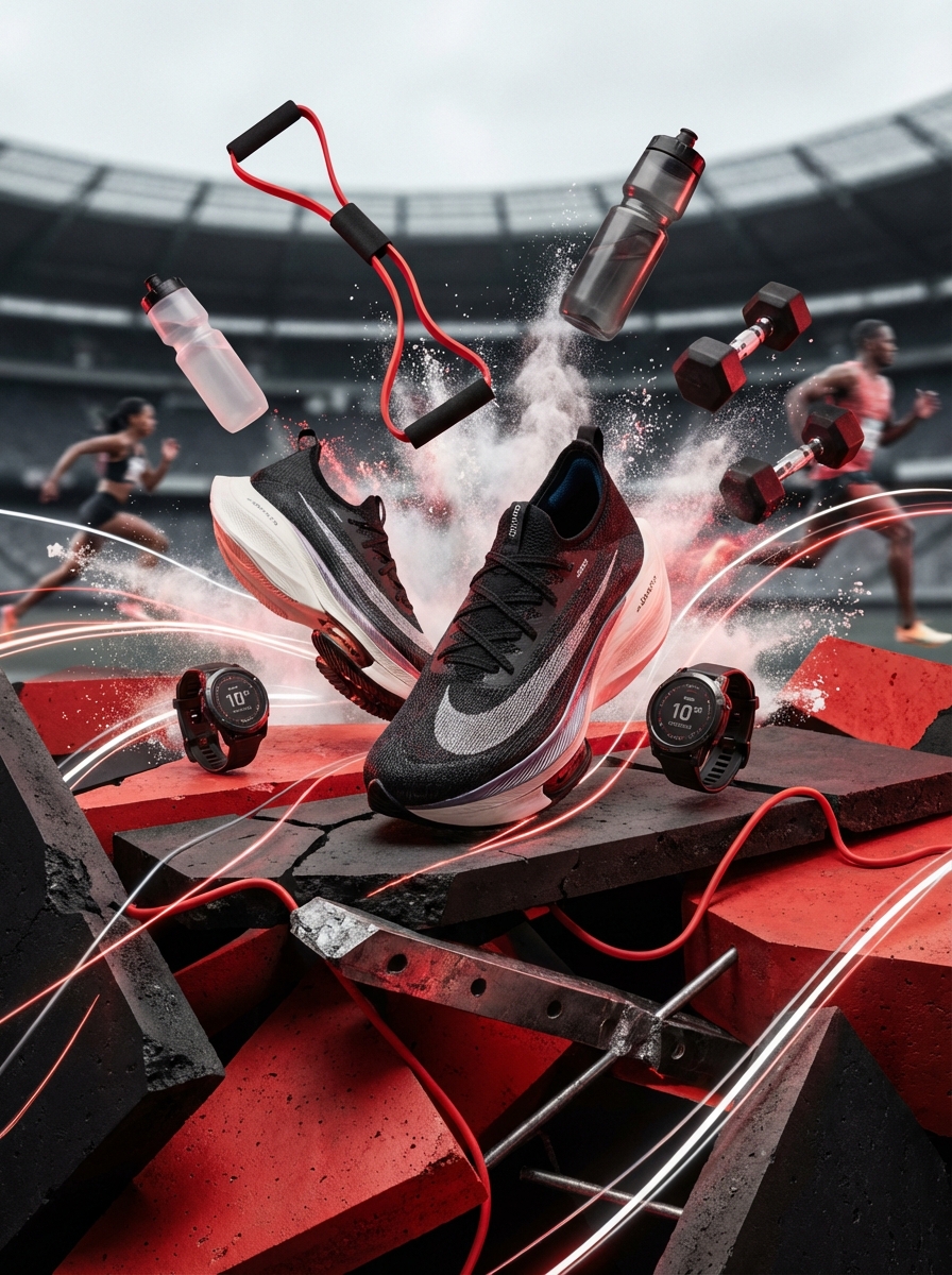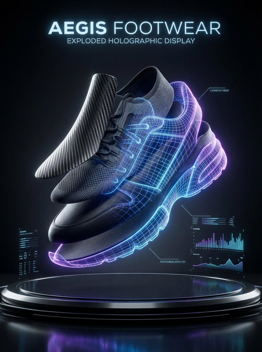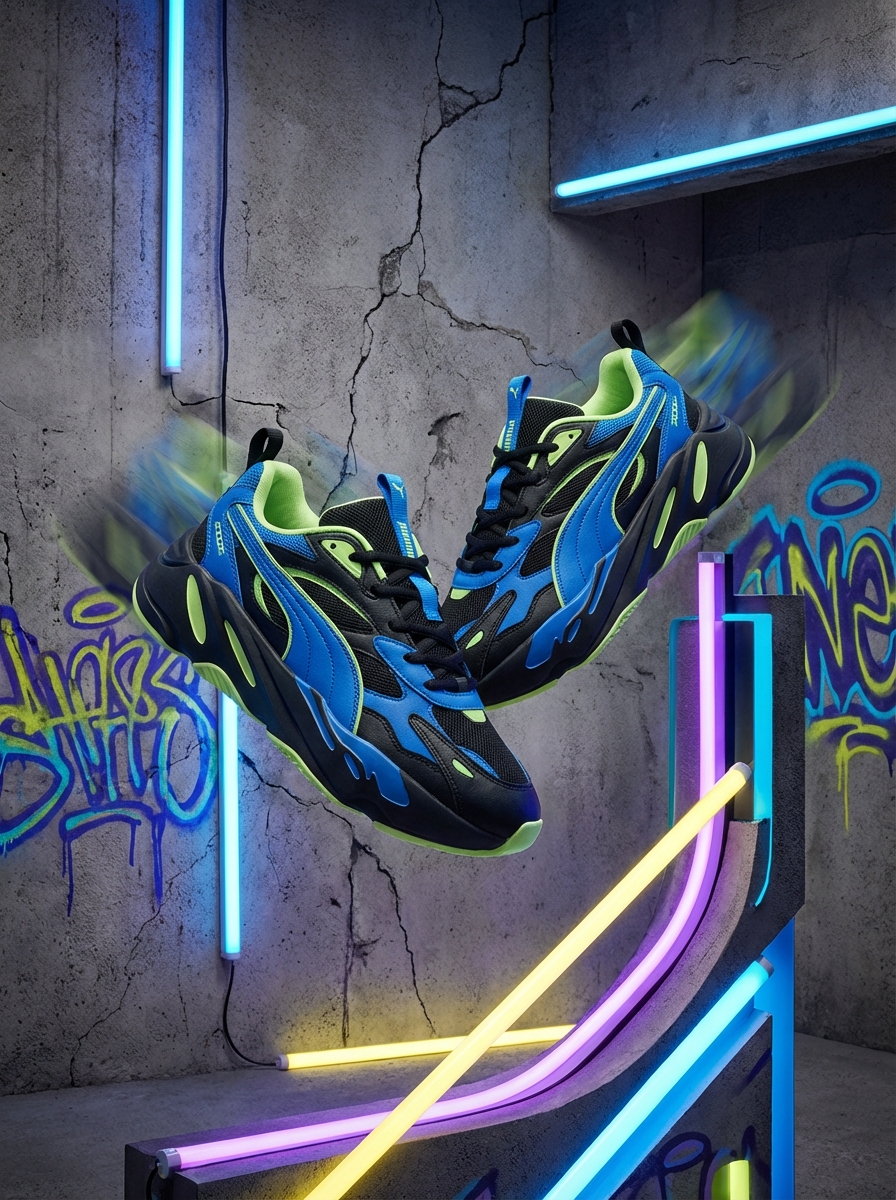 제품명이나 텍스트는 이미지 생성 후 Canva/Figma에서 추가하세요. 프롬프트에서 'neon blue and orange'를 원하는 브랜드 컬러로 바꿔보세요.