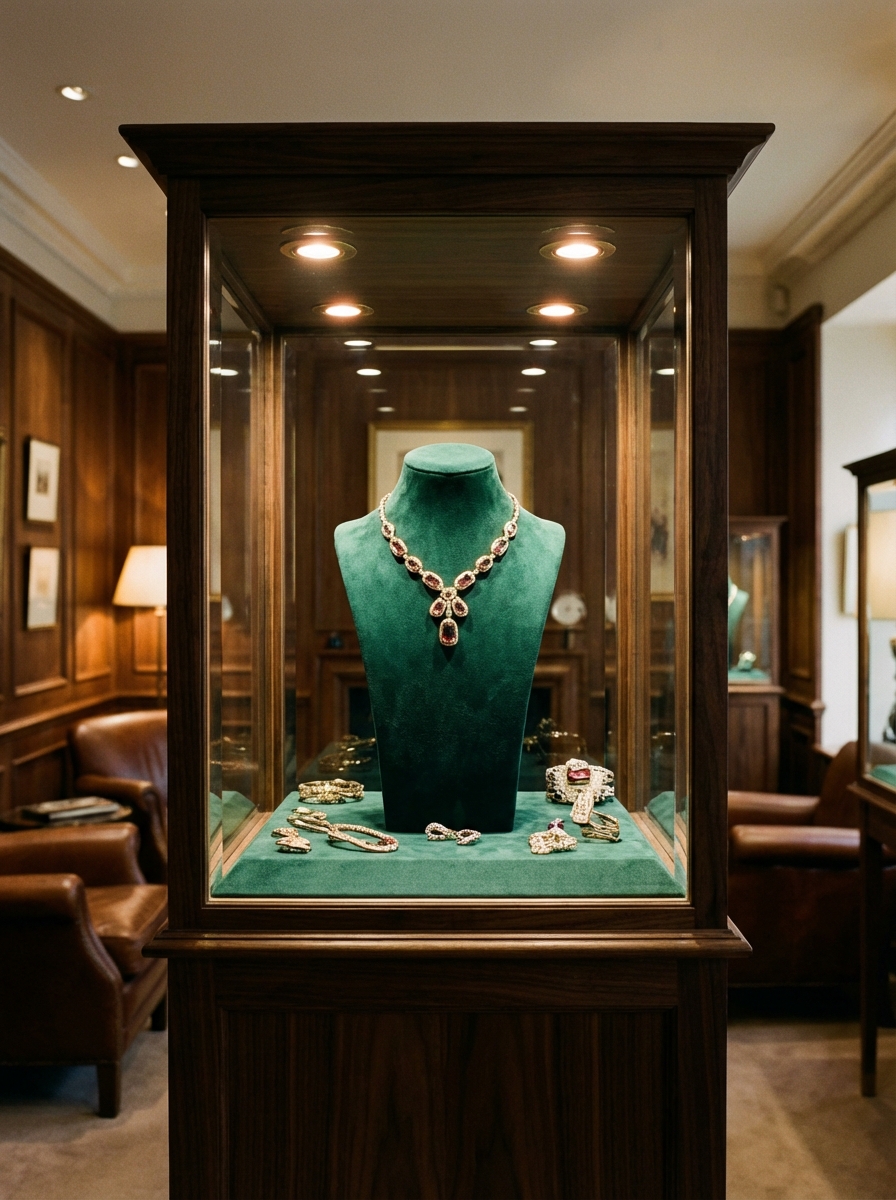 유리&크롬 소재가 럭셔리한 브랜드 이미지를 만듭니다. 실제 제품을 배치하면 프리미엄 쇼핑 경험을 전달합니다.