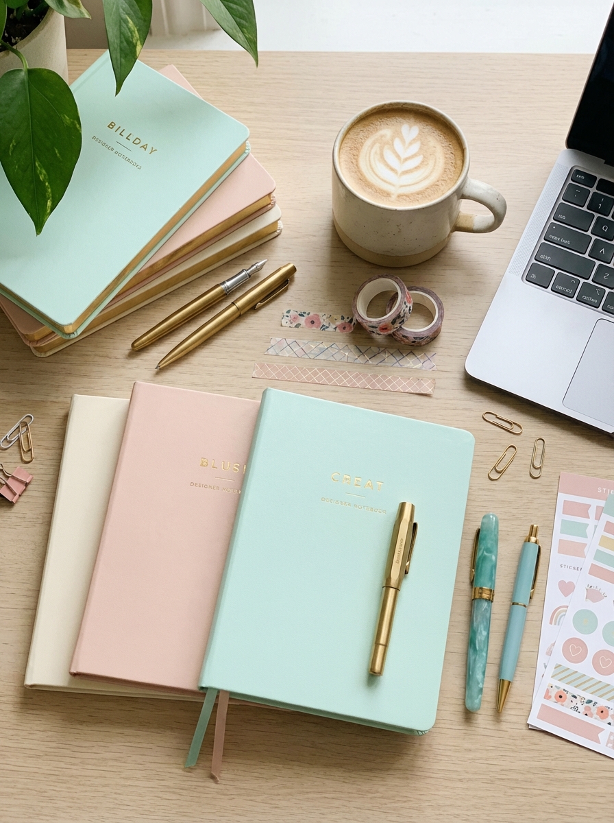 'lo-fi mood'와 'warm lamp light'가 집중력 있는 분위기를 만듭니다. 타이머 시간을 변경해 다른 시간대의 공부 세션을 표현하세요. 문구류를 실제 사용하는 것으로 교체하면 진정성이 높아집니다.