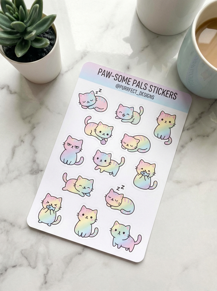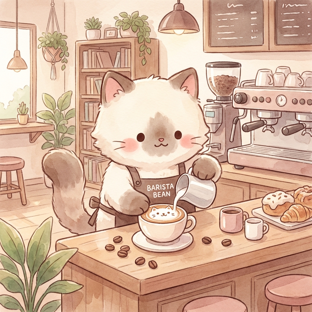 여러 고양이를 다양한 포즈로 배치하면 자연스러운 카페 풍경이 됩니다. 수채화 스타일이 따뜻한 분위기를 만듭니다.