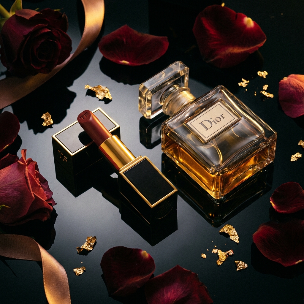'pink and gold'는 뷰티 콘텐츠의 정석 조합입니다. 제품을 중앙에 배치하고 'sparkling bokeh'로 고급스러운 분위기를 연출하세요.