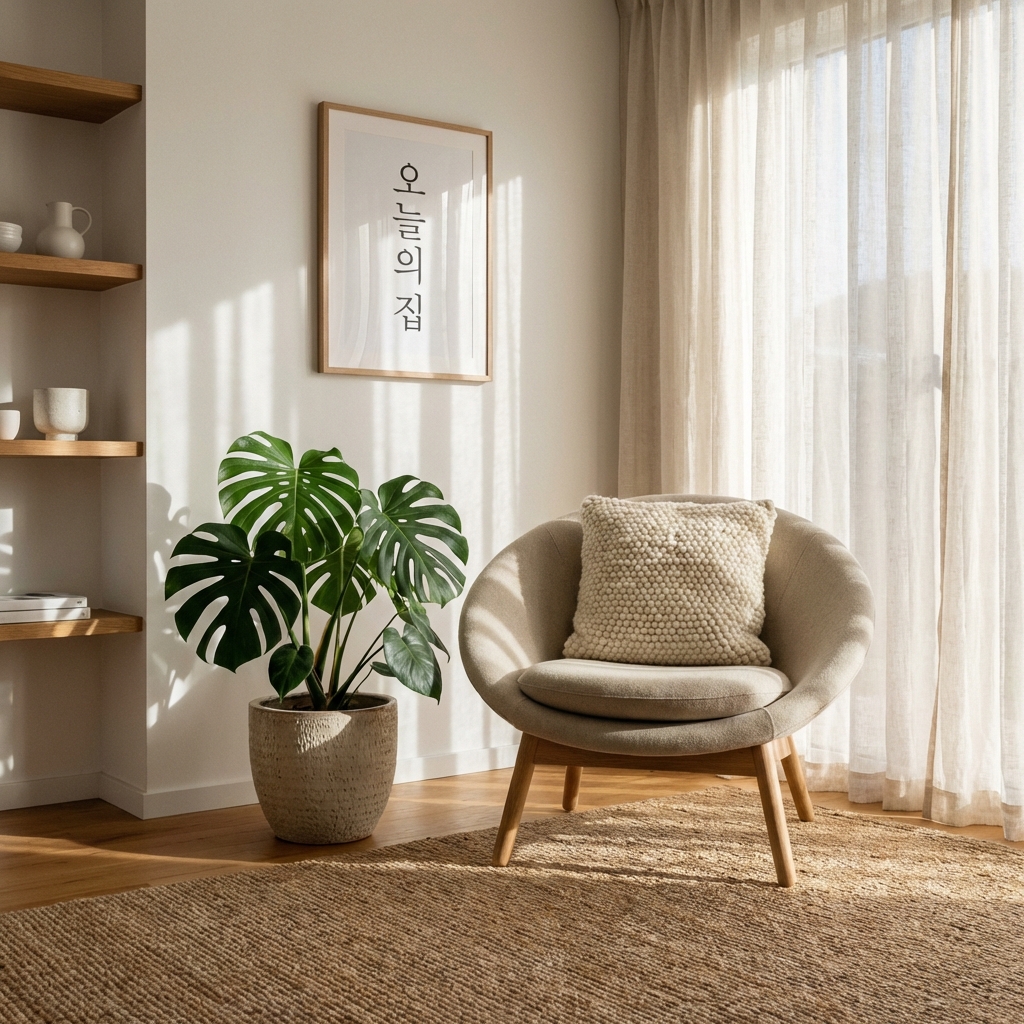 스트링 라이트와 식물이 감성 인테리어의 핵심입니다. 골든아워 조명이 공간을 따뜻하게 만듭니다.