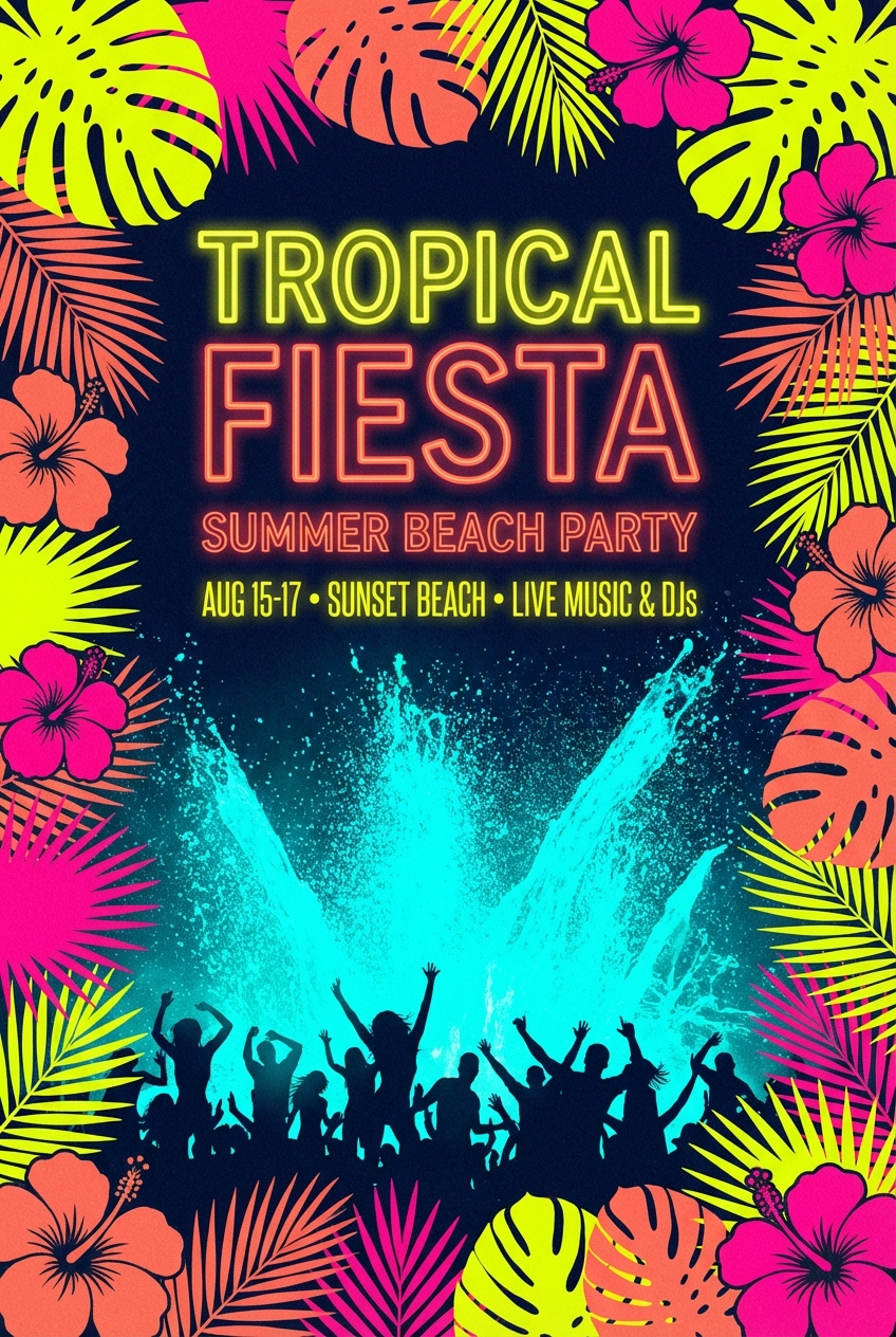 네온 그리드와 야자수 실루엣이 80년대 레트로의 아이콘입니다. 음악, 파티, 레트로 이벤트 배너에 적합합니다.