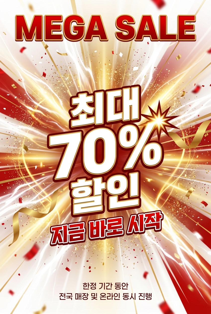 3D 텍스트가 평면 텍스트보다 훨씬 임팩트가 강합니다. 레드&골드가 세일의 긴급함과 프리미엄을 동시에 전달합니다.