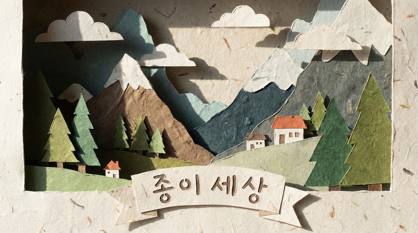 Charming paper craft diorama scene, layered paper cut-out landscape with mountains, trees and clouds, visible paper texture and shadows between layers, Korean text '종이 세상', handmade craft aesthetic, 16:9 aspect ratio