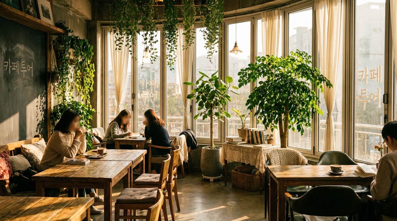 Dreamy cafe interior with floor-to-ceiling windows, afternoon sunlight streaming in, wooden tables and green plants, Korean text '카페 투어', warm cozy atmosphere, lifestyle photography style, 16:9 aspect ratio