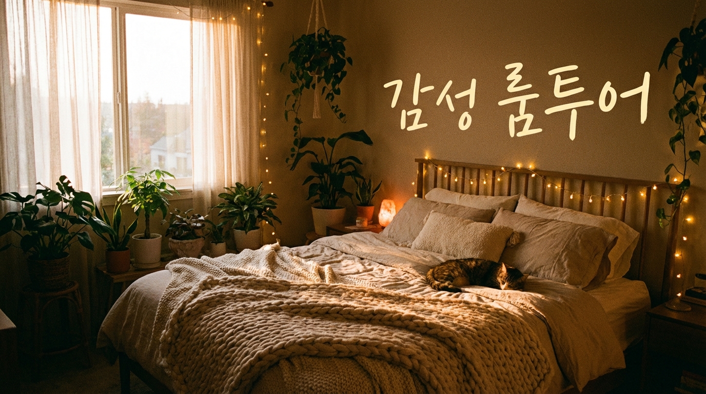 Beautiful room tour thumbnail, aesthetic bedroom interior with warm string lights, plants and cozy bedding, golden hour light through window, Korean text '감성 룸투어', interior vlog style, 16:9 aspect ratio