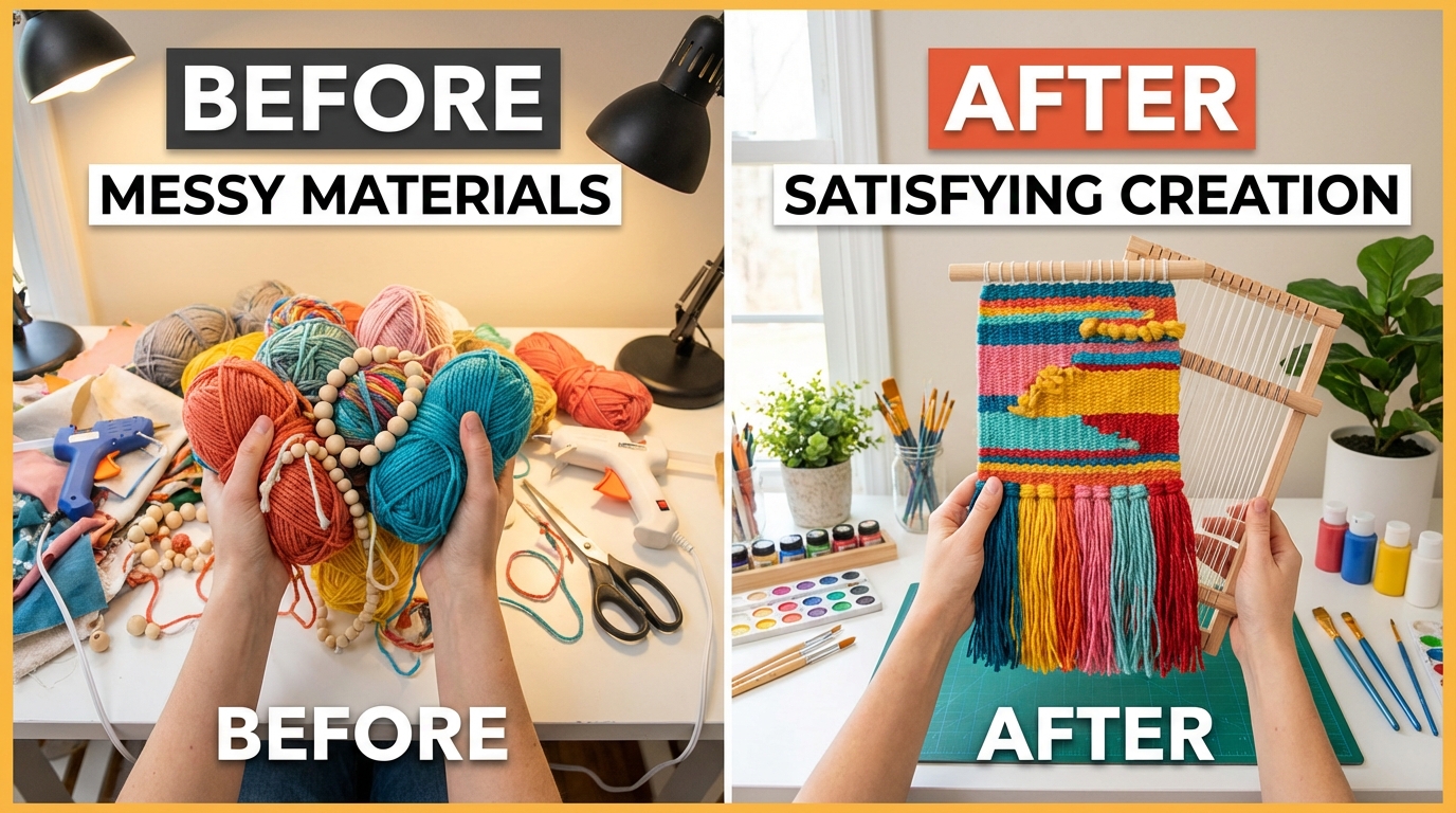 Creative DIY craft thumbnail, hands holding colorful handmade item, scattered craft supplies and tools around, bright workspace lighting, satisfying before-after split, Korean text '초간단 만들기', 16:9 aspect ratio