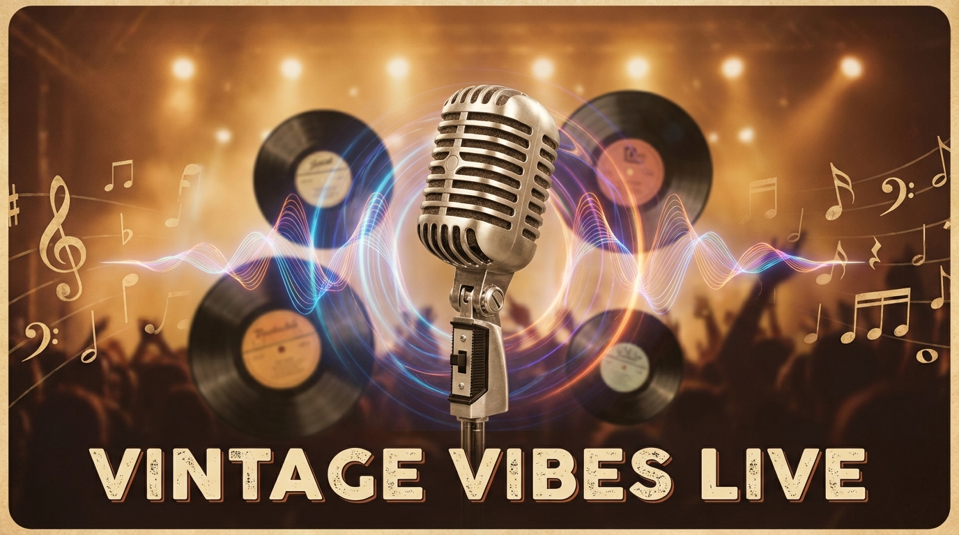 'vintage microphone'을 기타, 피아노 등 연주 악기로 변경하세요. 'retro vinyl records'가 음악적 감성을 극대화합니다. 무대 조명 색상을 장르에 맞게 조정해보세요.