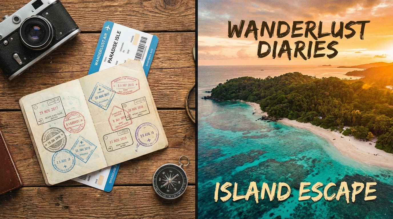 'tropical island'을 여행지에 맞게 변경하세요. 분할 구성이 섬네일의 정보 전달력을 높입니다. 'warm sunset colors'를 유지하면 설렘을 극대화할 수 있습니다.
