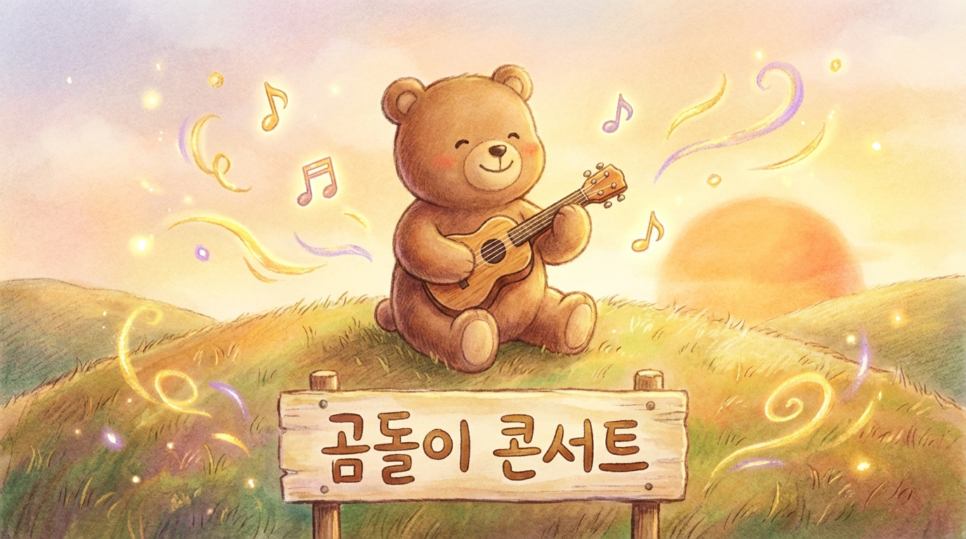 Adorable brown bear character playing a tiny ukulele on a grassy hill at sunset, music notes floating around, warm golden hour lighting, Korean text '곰돌이 콘서트', dreamy illustration style, 16:9 aspect ratio