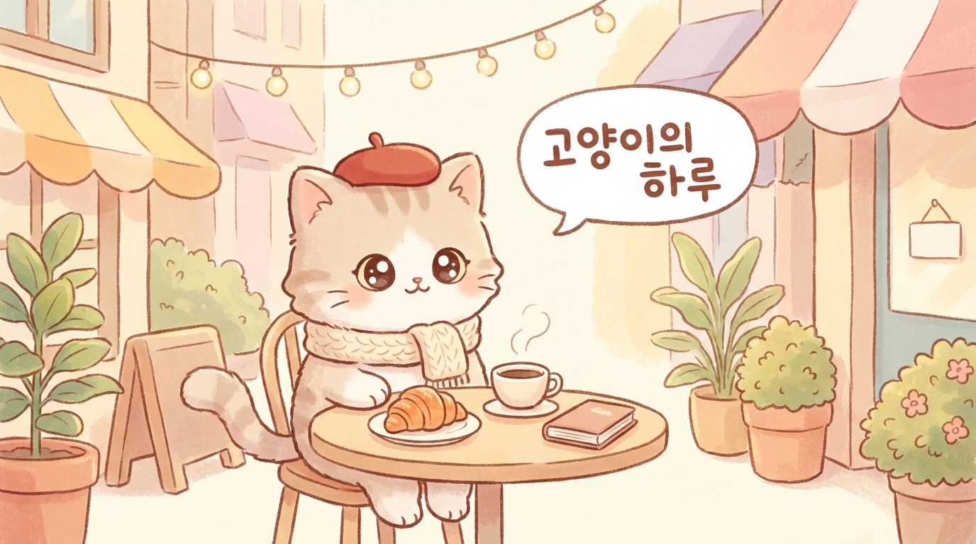 Adorable cartoon cat character wearing a tiny beret and scarf, sitting at a miniature cafe table with a croissant, cute kawaii illustration style, warm pastel colors, Korean text '고양이의 하루', expressive big eyes, 16:9 aspect ratio
